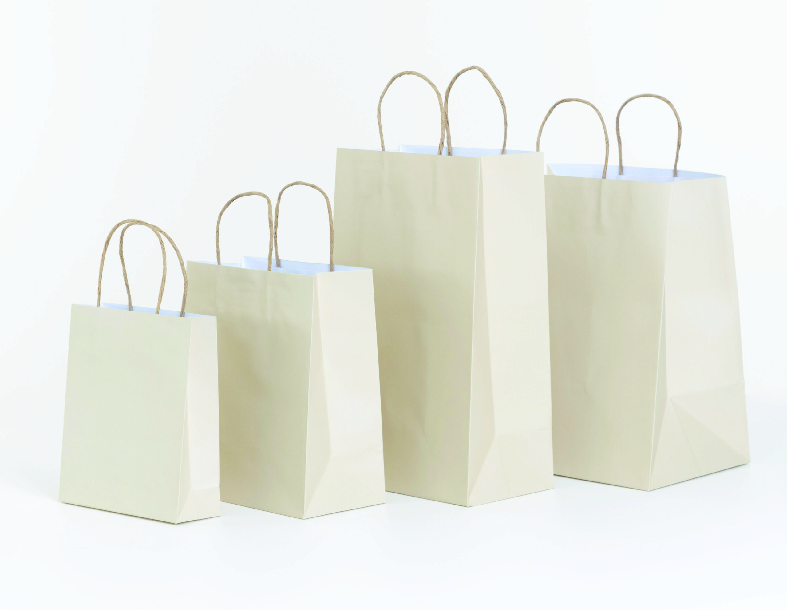 Bolsas de papel con acabado exterior en color BEIGE, que ofrecen una apariencia natural y una excelente resistencia para uso comercial.